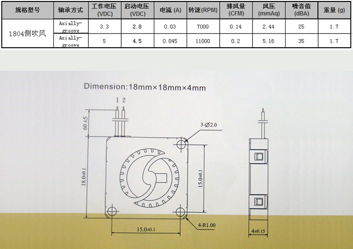 1:18*18*4MM不仅尺寸小且厚度薄的小鼓风机2.主要用于微型电子产品通风散热专用3.电压5V4.防护等级:1P525.线长50MM,无端 子6.耐温环境:-10°c-70°c7.预估寿命:20000小时8.外壳:PBT塑胶料9.阻燃特性等级:94-V0