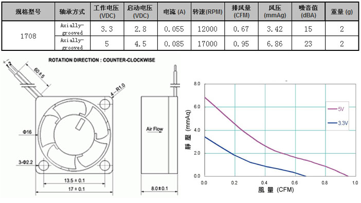 此款风扇的特点时尺寸17*17*8MM,又小又风大,电流低,功耗低电压:5V导线长度:50mm防护等级:IP52外框:94-V0扇 叶:94-V0预估寿命:20000小时耐温:-10 °c~70 °c